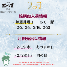 2月の銘柄肉の入荷スケジュールと、月例売出しの情報をお知らせいたします。